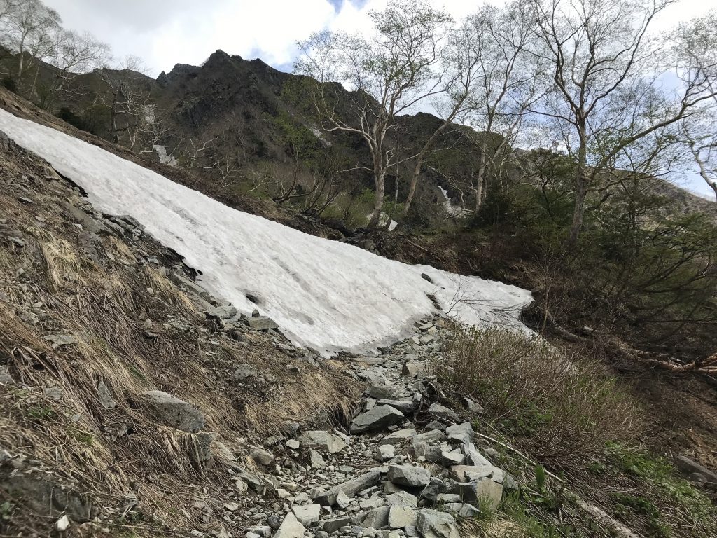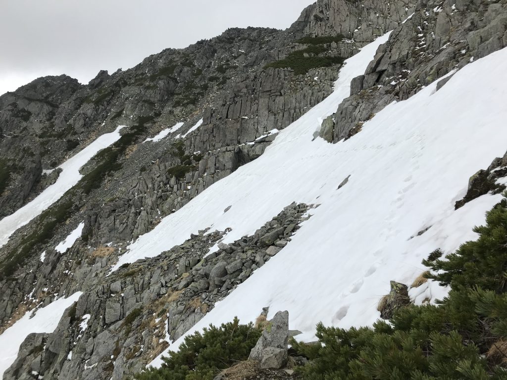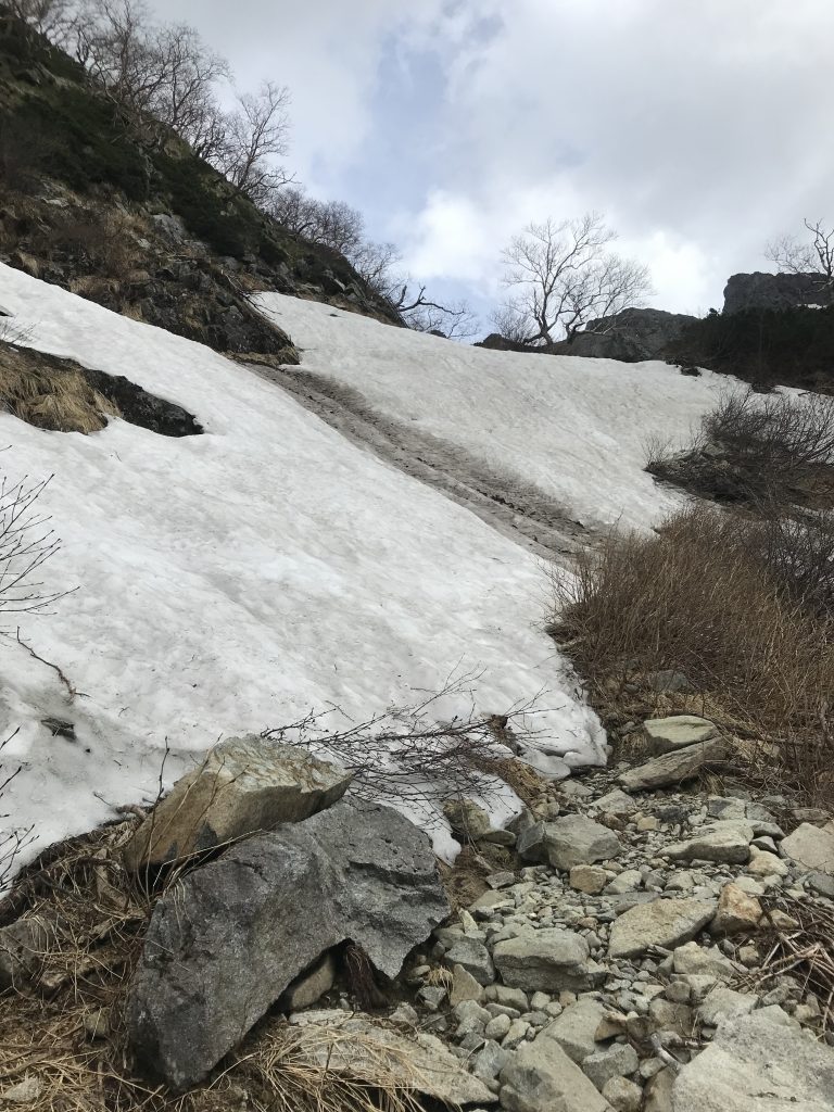こちらはさらに油断の出来ない雪渓のトラバースがいきなり現れます。少しでも参考になれば幸いです。