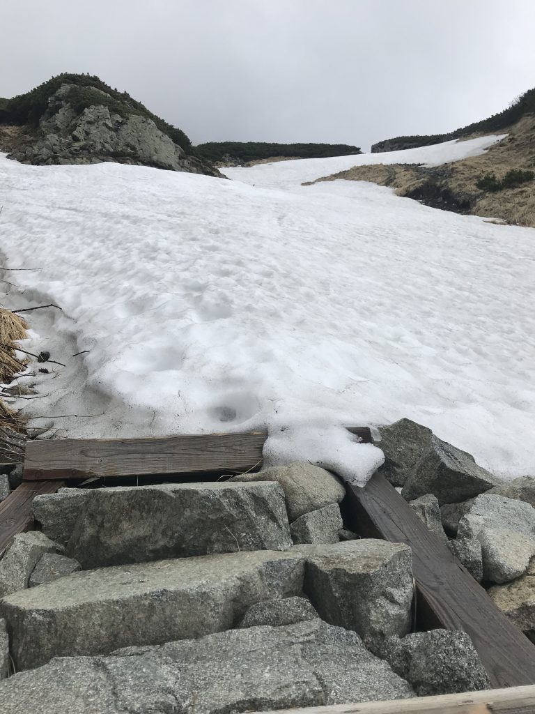 登り下りした感想は、少しでも不安に思ったら迷わずアイゼンピッケルを装備してください。と、いう事です。正直、雪渓と次の雪渓までは距離も長く、毎回脱いだり履いたりすることは億劫で、ついつい楽な方を選択してしまいがちですが、その結果、足を滑らせるかもしれないと考えると、必ず安全な選択をしてほしいと強く思いました。