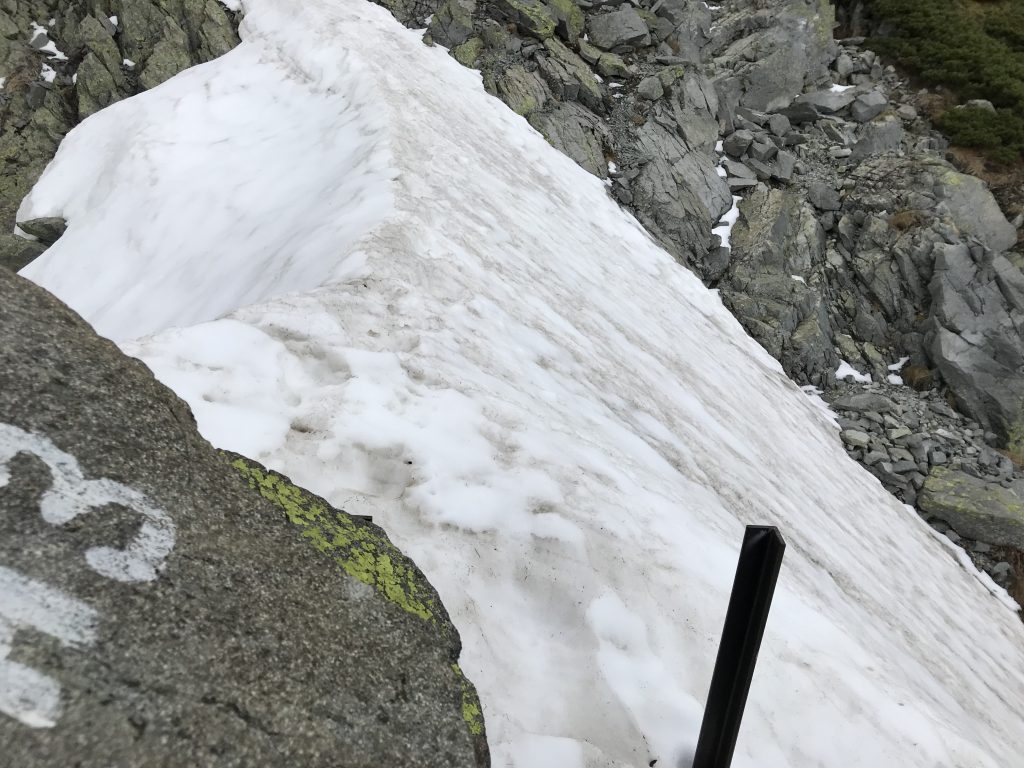 次は、長い梯子の手前に現れます。雪渓を登りきる辺りは斜度がますので、ここでもしっかりと足元を確保しながら登り降りしてください。雪がグサグサで、油断していると結構滑りますので要注意です。