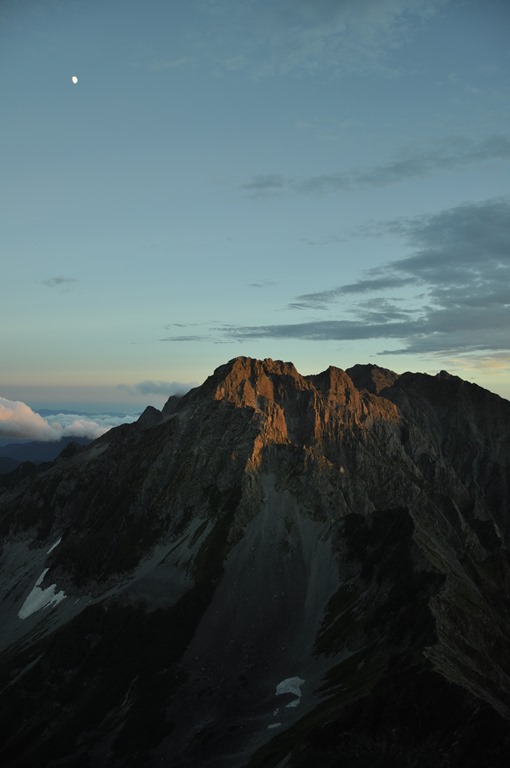 日没直前、夕陽で北穂がちょっぴり赤く染まり、上の空には白...