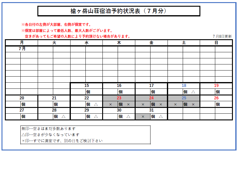 こんにちは。槍沢ロッヂです。7月1日から今シーズンの予約受...