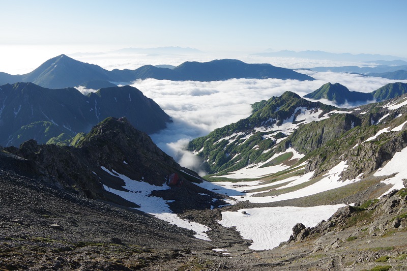 昨日(2日)に槍から南岳へとガスガスの中を移動し、今朝は曇...