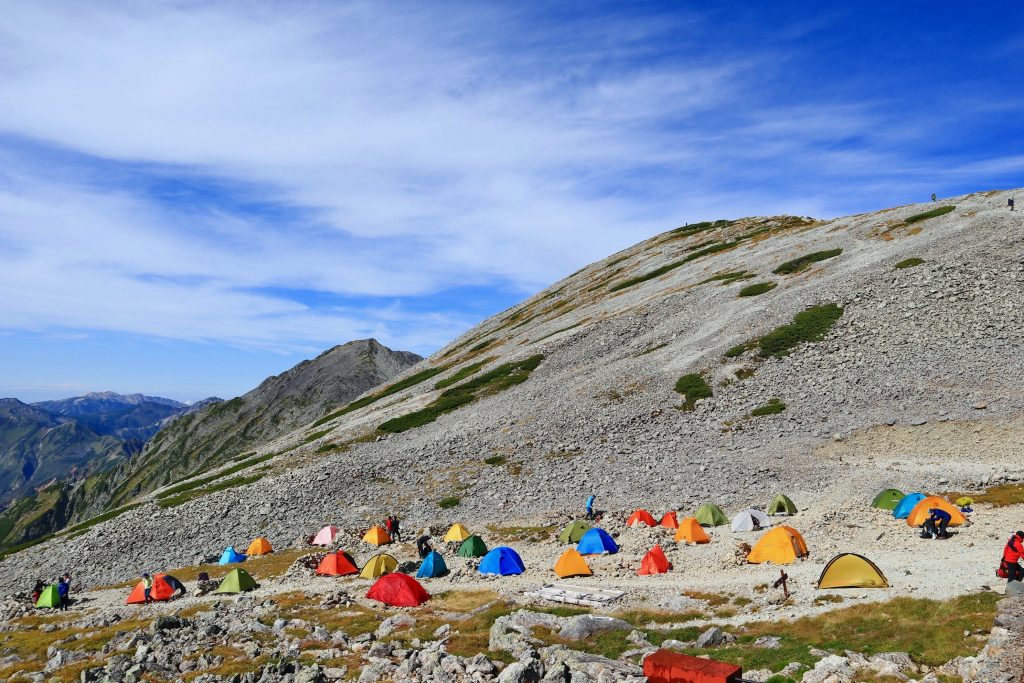 心配された雪もミゾレも雨すら降らず、朝のうちこそ曇り空だったものの、午前10時過ぎからは青空が戻ってきました。今日はテント場が大賑わい。