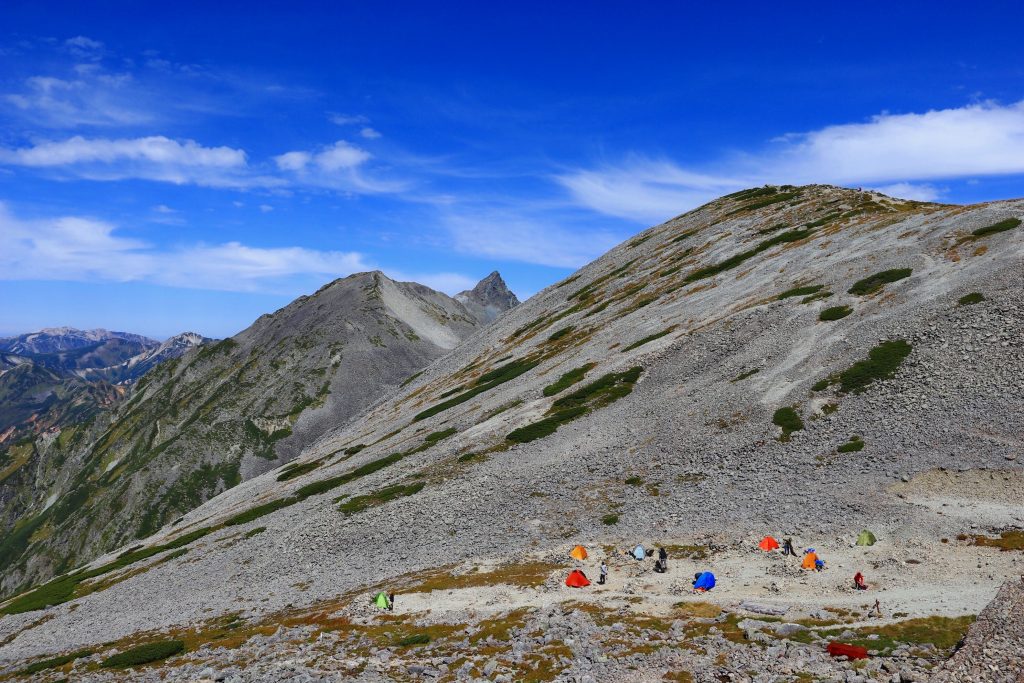 槍ヶ岳の上空に青空が広がり始めた午前11時、南岳にもそろそろテントが建ち始めました。槍ヶ岳山荘のテント場が午前10時過ぎには満杯となったため、そっちから流れてきた人も多かったようで、午後からはドンドンとテントが増えていきます。