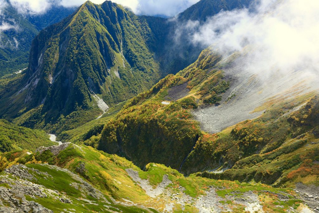 霧が晴れ視界が広がると、昨日の雨によりさらに木々の色付きが進み、おおむね標高2500mのあたりは見頃を迎えていました。(槍沢や涸沢のメインエリアは標高2200m~2400mとなります)