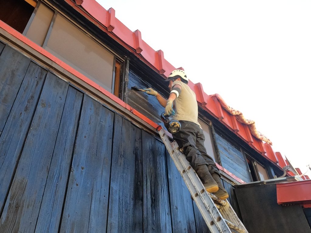 今回は雲が多いものの、晴れ間もあって外壁の塗装、登山道のマーキング、草刈、布団干し、館内清掃を行いました。